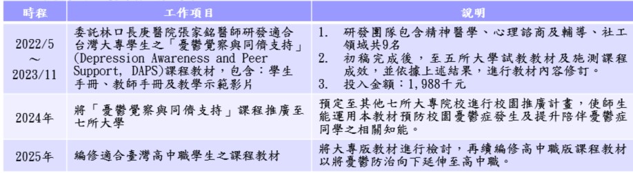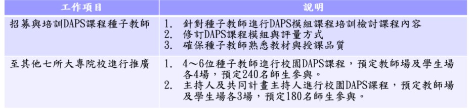 (三)預定先在北區培訓4~6位種子教師,並推展到其他七校420位大專 院校師生參與憂鬱覺察與同儕支持(DAPS)課程,預定工作項目如下