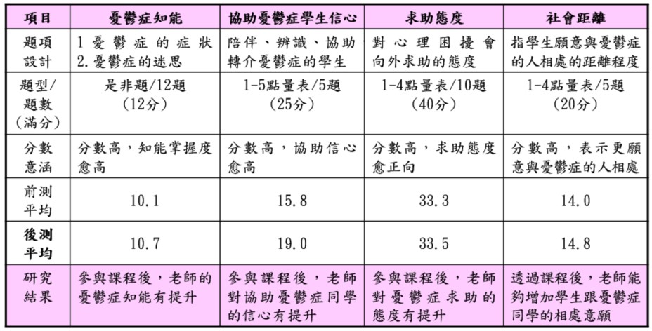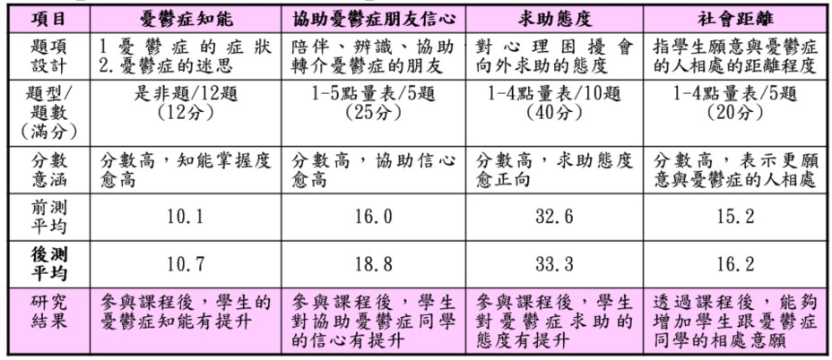 (三) 課程實施前後比較結果: 參與本課程教師與學生確實可提升「憂鬱症的知能」、「協助憂鬱症者的信心」及「憂鬱症求助的態度」,並更願意與憂鬱症的人相處,降低「與憂鬱症者的社會距離」。