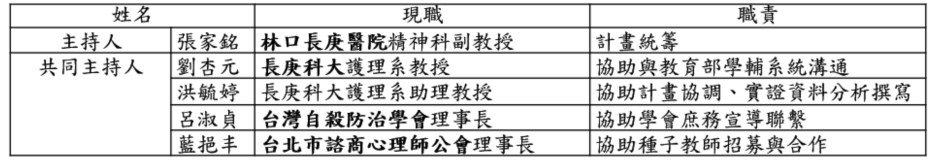 (二)計畫主持人(教材研發者)張家銘醫師規劃結合長庚大學、臺灣自殺防治學會、臺北市諮商心理學會共同推動,參與學者專家名單如下: